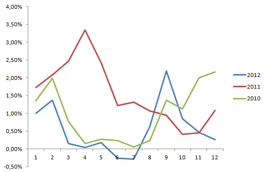 Nhìn lại năm 2012, CPI chỉ tăng 6,81% so với tháng 12/2011, xấp xỉ mức tăng 6,52% của năm 2009, thấp hơn nhiều so với mức tăng 11,75% của năm 2010 và mức tăng 18,13% của năm 2011. Nhưng, năm nay là năm chỉ số giá có nhiều biến động bất thường.