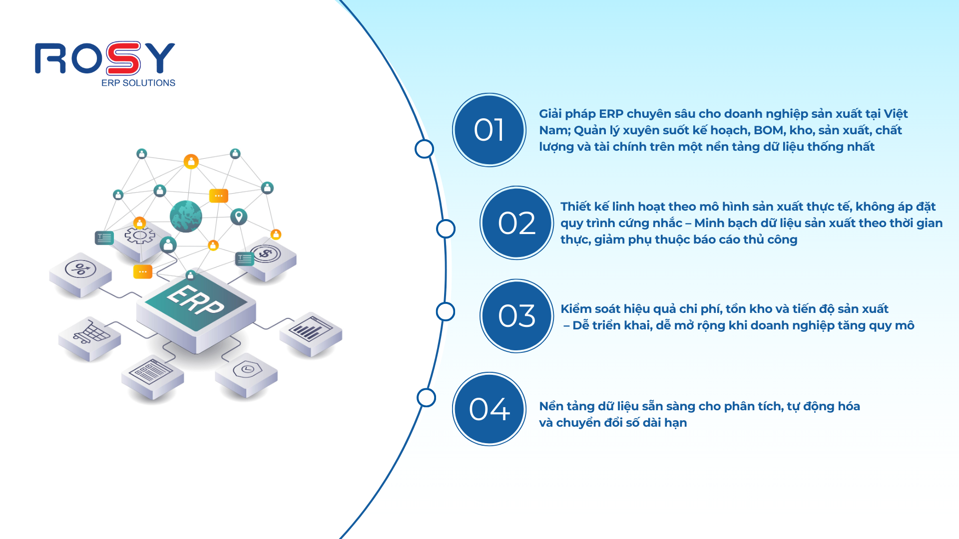 ERP ROSY cũng được xây dựng theo hướng triển khai linh hoạt, phù hợp với lộ trình của doanh nghiệp Việt. Doanh nghiệp có thể bắt đầu từ các nghiệp vụ cốt lõi của sản xuất, sau đó mở rộng dần sang các chức năng nâng cao như mã vạch, QR, quản lý vị trí kho hoặc tích hợp các giải pháp quản lý sản xuất chuyên sâu khi quy mô tăng lên. Với định hướng đồng hành cùng doanh nghiệp trong quá trình chuẩn hóa quản trị sản xuất, ERP ROSY không chỉ là công cụ ghi nhận số liệu mà trở thành nền tảng quản trị giúp doanh nghiệp kiểm soát nhà máy, tối ưu chi phí và xây dựng dữ liệu bền vững cho phát triển dài hạn.