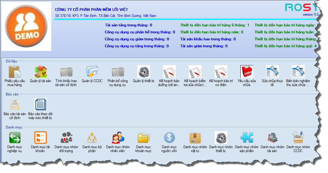 Phần mềm ERP ROSY đã phát triển và xây dựng nên Module Quản Lý Máy Móc Thiết Bị triển khai thành công cho nhiều khách hàng như Thực phẩm Thiên Hương, Thép Nhà Bè, Giấy Đồng Tiến…