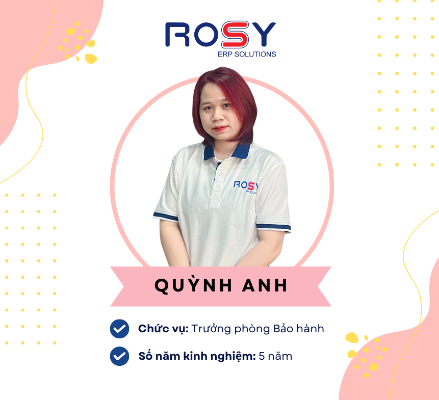 Bảo hành phần mềm là một công việc đòi hỏi rất nhiều kỹ năng chuyên môn, tính kiên trì, sự tỉ mỉ, khả năng lắng nghe & giải quyết vấn đề,... và Quỳnh Anh gần như hội tụ đủ các tiêu chí đó. Sự nhiệt tình và tâm huyết trong công việc đã giúp Quỳnh Anh trở thành điểm tựa vững chắc cho khách hàng của ROSY trong mọi tình huống.