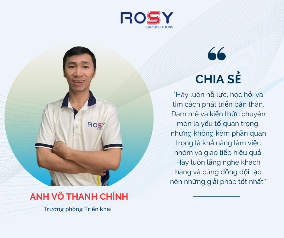 ROSY cảm ơn anh Chính đã tham gia buổi phỏng vấn và chia sẻ những câu chuyện cũng như kinh nghiệm làm việc của mình trong lĩnh vực giải pháp phần mềm ERP. Với hành trình gắn bó lâu dài và những thành tựu đáng nể đó, anh Võ Thanh Chính là một nguồn cảm hứng cho tất cả những nhân viên trong công ty, khẳng định rằng sự kiên trì, đam mê và khả năng lãnh đạo đóng vai trò quan trọng trong việc đạt được thành công và phát triển bền vững.