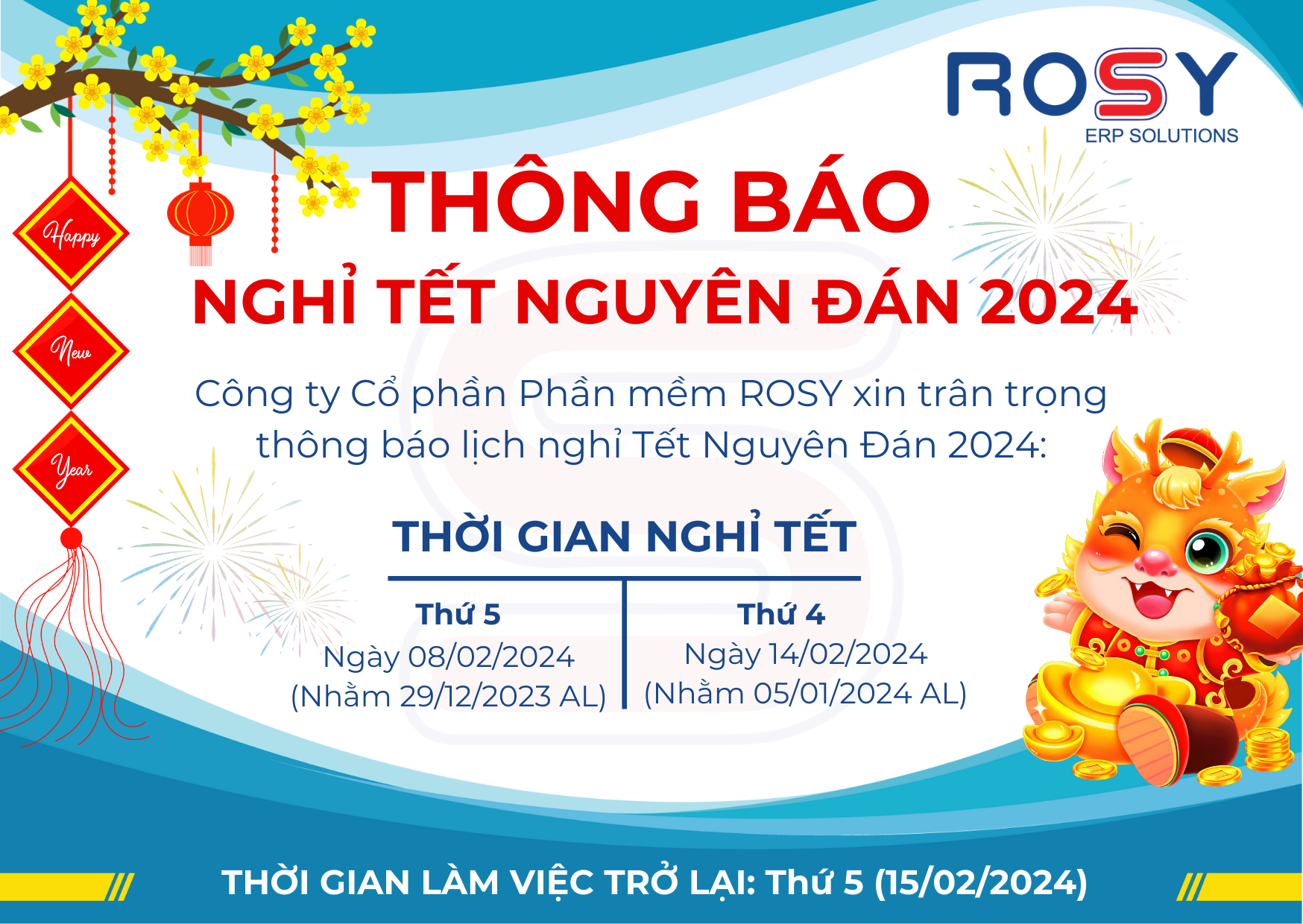 Công ty Cổ phần Phần mềm ROSY xin thông báo thời gian nghỉ lễ TẾT NGUYÊN ĐÁN 2024 như sau: